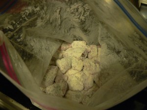 Season about a half cup of flour with lots of pepper, garlic salt & seasoned salt. Shake about half of the meat at a time to cover completely.
