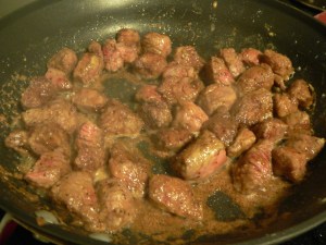 Brown about half of the seasoned stew meat at a time in the butter for about a minute on both sides. When nice and brown, transfer meat to a bowl and set aside.