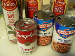Next pour in a can of beef broth, or two if you have them available…top with one can of tomato soup. Add a couple of bay leaves, then a little more garlic salt and pepper. Pop on the lid and you’re ready to rock and roll!