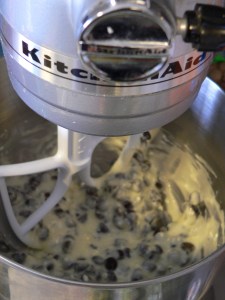 Beat the cream cheese, egg and sugar together, then fold in chocolate chips.  This easy filling takes these cupcakes from ho hum to YUM YUM!!!