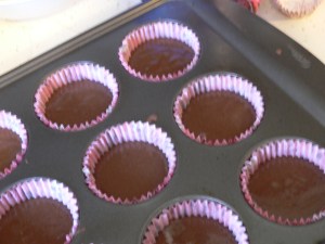Place paper liners in cupcake pan and fill 2/3 full.  We use an ice cream scoop to make it easy to fill the little cups.