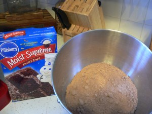We were in a hurry this time, so just mixed up a Devil’s Food Cake Mix as directed.  The real recipe is delicious though and very easy to make.