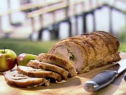 Preheat oven to 375. In a large skillet, heat the olive oil over medium-high heat. Add the onion, apples and sage. Saute until softened. Remove from the heat and gently stir in the bread, egg, butter and salt ant pepper. Add the chicken broth gradually until everything is moistened. Let the stuffing mixture cool completely before putting it in the pork loin. Spoon the stuffing down the pork, horizontally, in a line. Roll the pork over the stuffing, jelly roll style, ending with the seam down and fat side up. Lightly score the fat, in a diamond pattern, with a sharp knife. Tightly tie the pork roast up with butcher’s twine, season it with more salt and pepper, and transfer o a roasting pan. Roast the pork in a preheated oven for about 90 minutes or until an instant read thermometer registers 160 degrees. Remove from the oven and let rest for 15 minutes before slicing. Garnish with apples and fresh herbs.