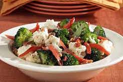Break the broccoli amd cauliflower into small pieces and combine in a large bowl. Add the raisins, red onion, bacon and cashews. Mix dressing ingredients together and pour dressing over salad. Serve.
