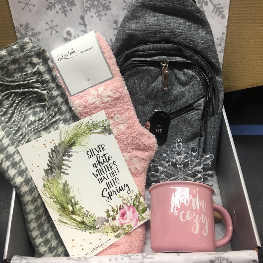 Other items include very soft socks, a “warm and cozy” pink mug and a sweet acrylic snowflake ornament that you could hang in a sunny window. We chose to have less items in this box and have very high quality on the items that we selected.