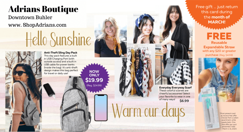 The sun is ALWAYS shining INSIDE Adrians in downtown Buhler, and today is no exception! Whether you pop in personally, shop online at www.ShopAdrians.com or give us a call (620-543-6488), we are here to serve you. We APPRECIATE your business and are so thankful for each of you!
