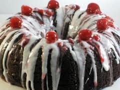 Preheat oven to 350. In a large bowl place ALL ingredients. With electric mixer blend on low speed, then mix on medium speed for 1 minute. Pour batter into a greased bundt or tube pan. Bake for 45 to 55 minutes or until done. Cake is done when top springs back to touch or when a toothpick is inserted and comes out clean. Cool slightly in pan and then invert onto a serving plate. Pour glaze over warm cake. Spoon any excess glaze from plate back onto cake. Garnish with maraschino cherries.