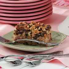 Preheat oven to 350 degrees. Pour boiling water over dates. Let cool. Cream shortening and 1 cup sugar in separate bowl. Add eggs and beat well. Sift flour with soda, salt and cocoa. Add flour mixture to shortening mixture alternately with date mixture, adding the dry ingredients first and last. Pour batter into reased 9 x 13 pan. Combine chocolate chips, sugar and chopped nuts, then sprinkle over batter. Bake for 35 minutes. I’m not sure where my mother, Ruth originally got this recipe, but know that this was one of our family’s all-time favorite desserts from our growing up years! Delicious with a large glass of icy cold milk!