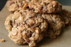 Mix together all ingredients except Rice Krispies and chocolate chips. Fold in Rice Krispies and chocolate chips. Drop by rounded teaspoon on greased baking sheet. Bake at 350 degrees for 12 minutes. *Can substitute chocolates with one or a mixture of several of these: about 1 to 1 1/2 cups dried cranberries, peanut butter chips, chopped pecan or macadamia nuts, white chocolate chunks, or raisins…whatever you like.