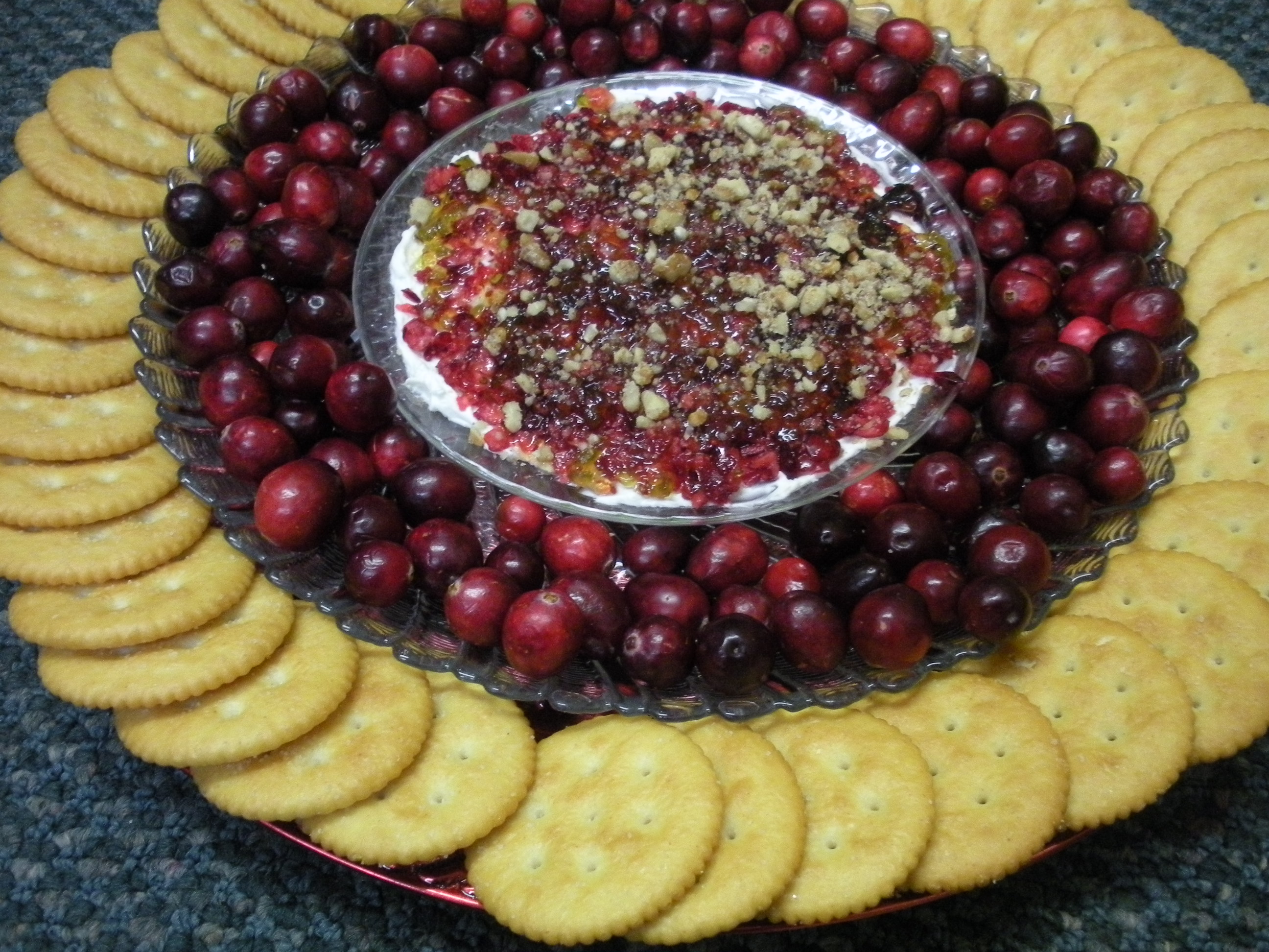 On small (dessert size) plate. Spread softened cream cheese. Top with chopped fresh cranberries, then pecans and pepper jelly. Place on dinner size plate. Arrange fresh cranberries around smaller plate. Place on platter or charger…arrange Ritz crackers around outer rim of platter. Beautiful! Everyone loves this delicious appetizer!