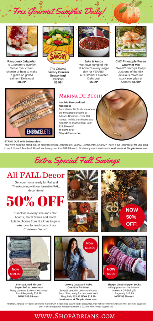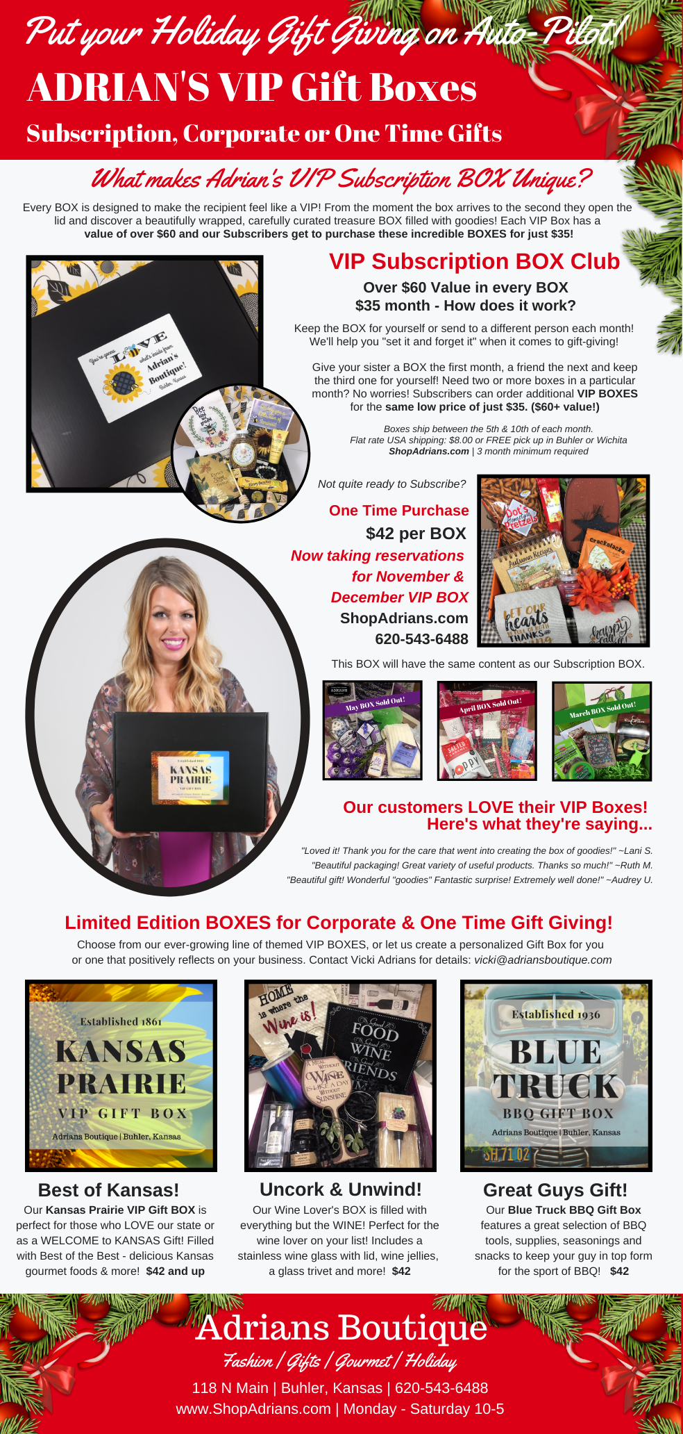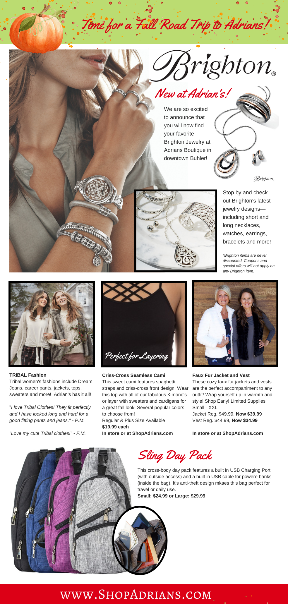 Filled with hand picked products and lots of great offers, we hope you’ll browse through all 32 pages, then stop by our shop in Buhler to experience the Adrians Boutique Magic in person!