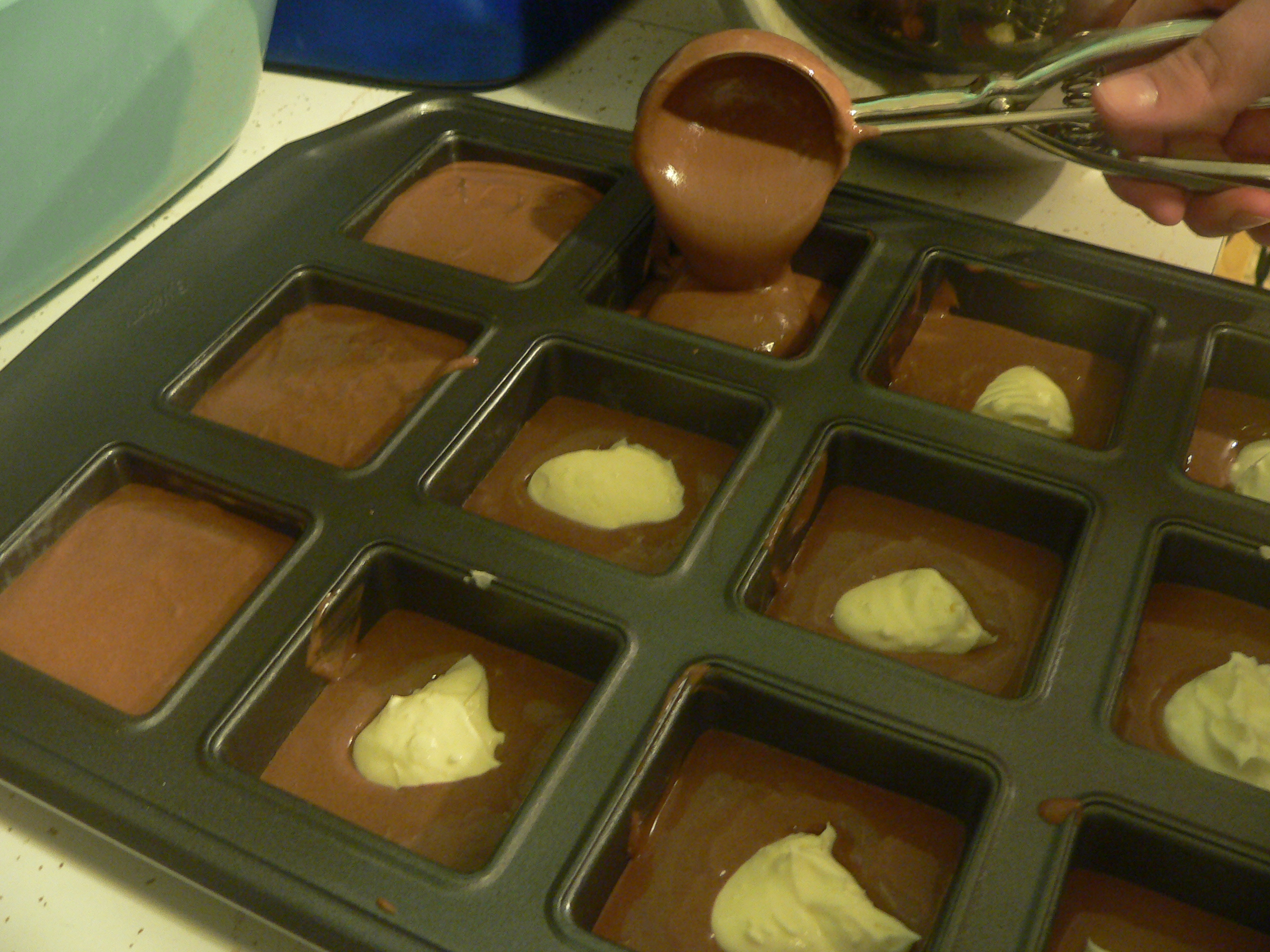 Now we carefully add the cream cheese filling mixture using a smaller cookie scoop. Try to get the filling right in the middle of each little cake for a prettier presentation. We used a size 24 scoop for this (about 1 Tablespoon size).