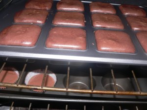 Next fill the mini cake pan with batter. We use an ice cream scoop so that we can measure out the batter evenly. You can also use a regular cup cake pan if you don’t have the square style…they taste just as good!