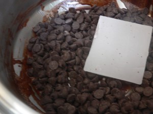 Melt the chocolate chips and paraffin in the top of a double boiler.