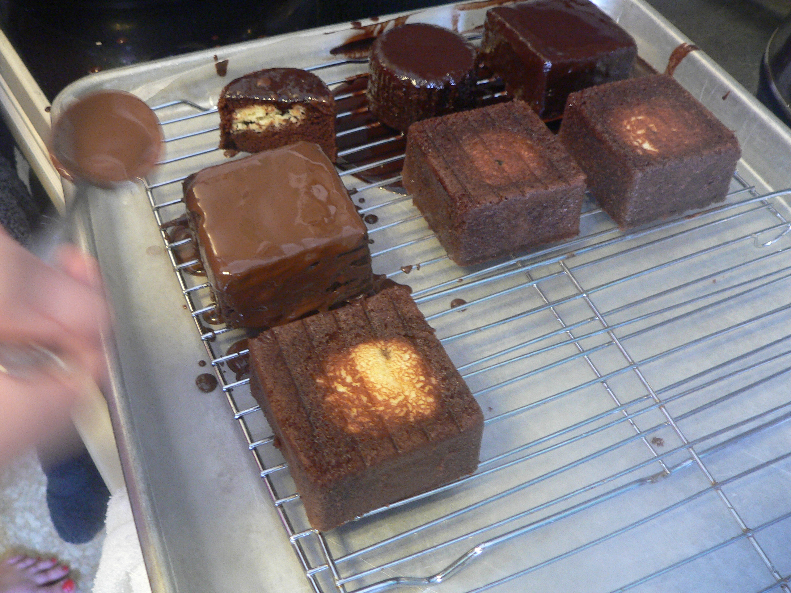 The chocolate mixture will be thin. We “frosted” the 4 sides with the back of a spoon, then coated the top of the cakes and let the mixture drip off the sides. Let completely dry…about 20 minutes.