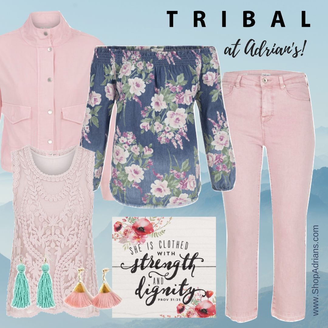 Our customer have loved the washed pinks from this TRIBAL collection! We love the off the shoulder (or on, however you like it!) of the floral top. TRIBAL’S Dream Jeans are so comfortable to wear! Be sure to stop by and give them a try!